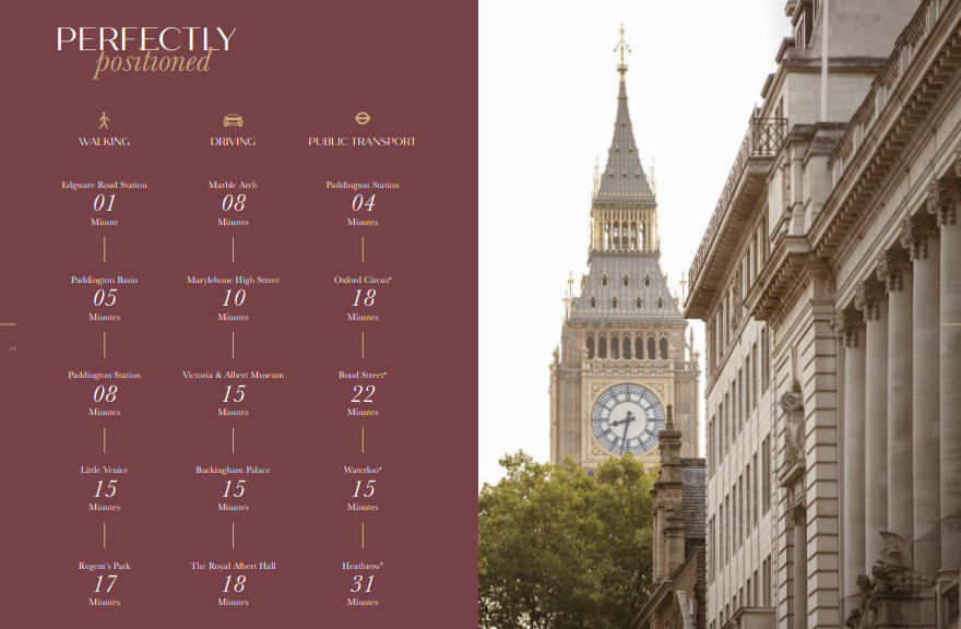 小区步行范围内有多个地铁站点,其中包括3个位于1区的站点。与项目紧邻,只有几步之遥的埃奇韦尔路站(Edgware Road Station)提供贝克卢线(Bakerloo Line)服务,1站可达马里波恩,3站可达摄政公园。