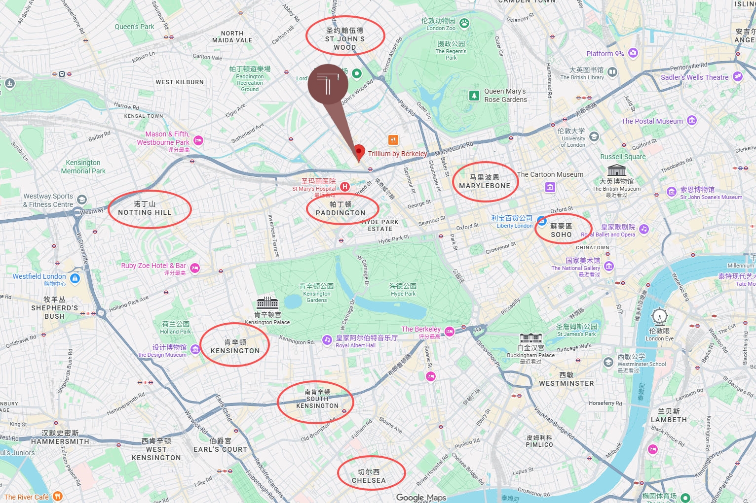 除了“皇家浓度”过高,翠麟·海德公馆几乎被伦敦的富人区包围了。其南侧是肯辛顿(Kensington)、切尔西(Chelsea)、梅菲尔(Mayfair)等几个享誉海内外的区域,这几个区向来与上流社会紧密相连,是人人向往的居住地。