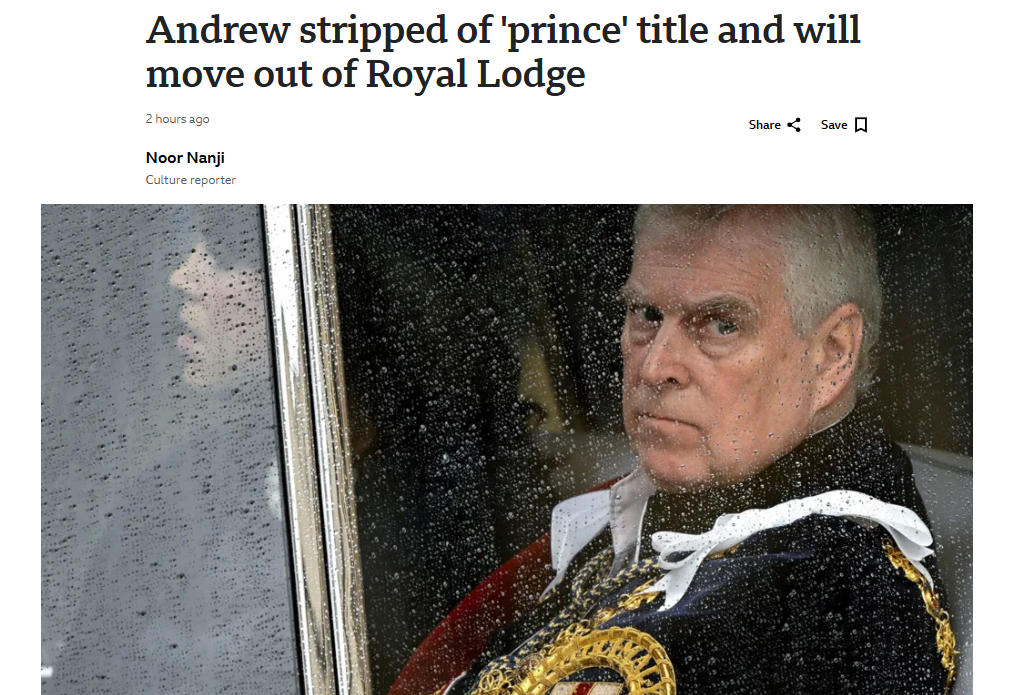 面对持续的舆论压力,英国皇室也不得不放下“亲情”,对安德鲁做出“清算”。今年10月,白金汉宫宣布,查尔斯国王已启动正式程序,剥夺安德鲁所有的王室头衔,包括“王子”称号,并要求其搬出温莎。