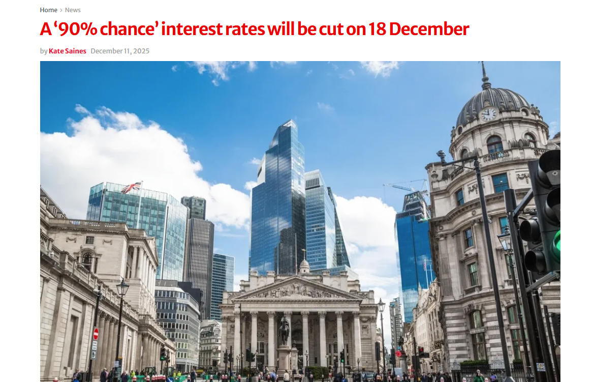 尽管英国央行下一次利率决策会议要到下周四(12月18日)才举行,但市场目前普遍认为降息的可能性高达90%。