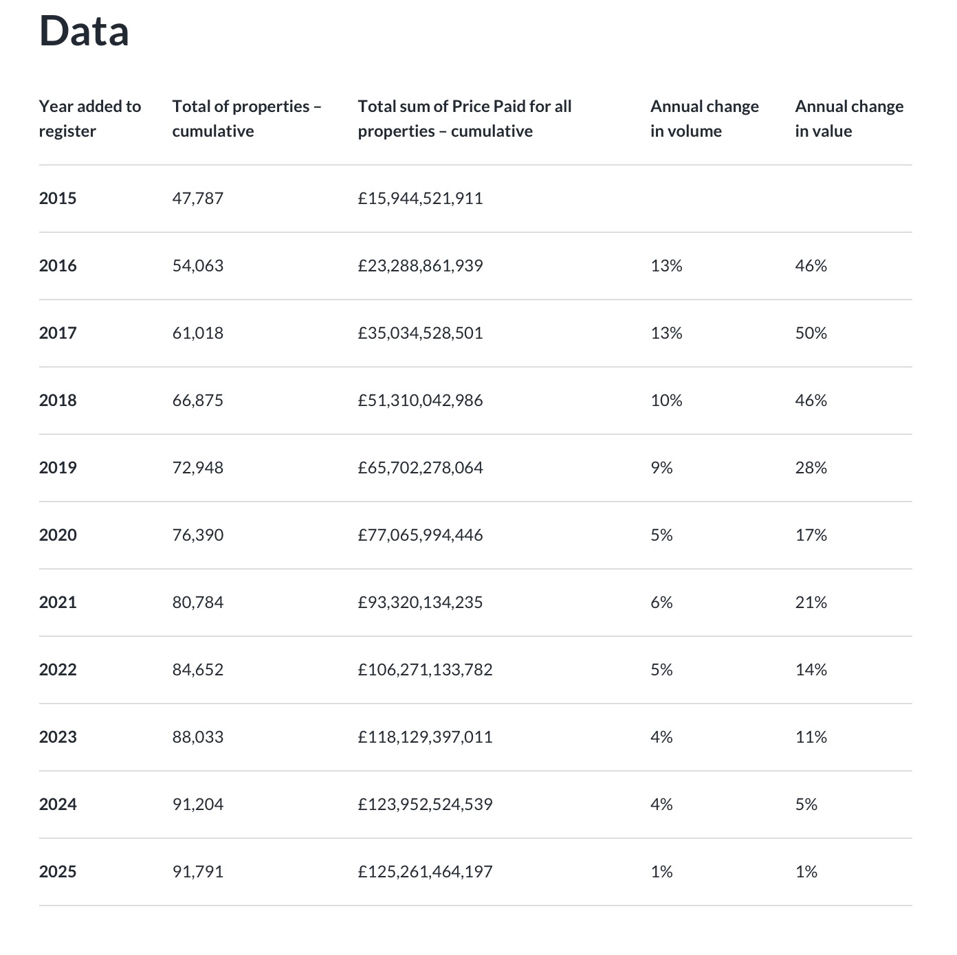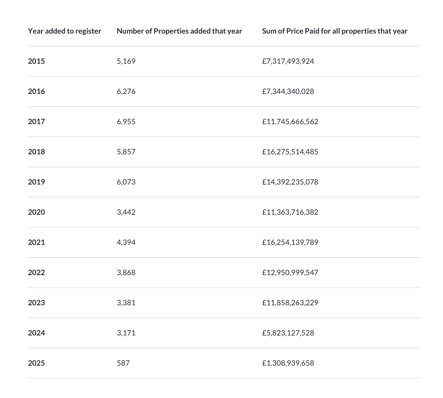 根据法律科技公司Search Acumen的最新分析,海外公司名下的房产数量几乎翻了一番——从2015年的47,787套,增加到2025年的91,791套,总价值已经超过1,250亿英镑,创下历史新高。