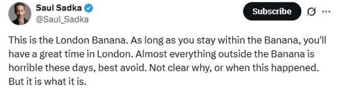 他还为这张图配文道:“这就是London Banana。只要你待在这个香蕉区内,你在伦敦就会过得很棒。现在香蕉区外几乎所有东西都很糟糕,最好别去。不清楚为什么,也不知道什么时候发生的。但事实就是如此。”
