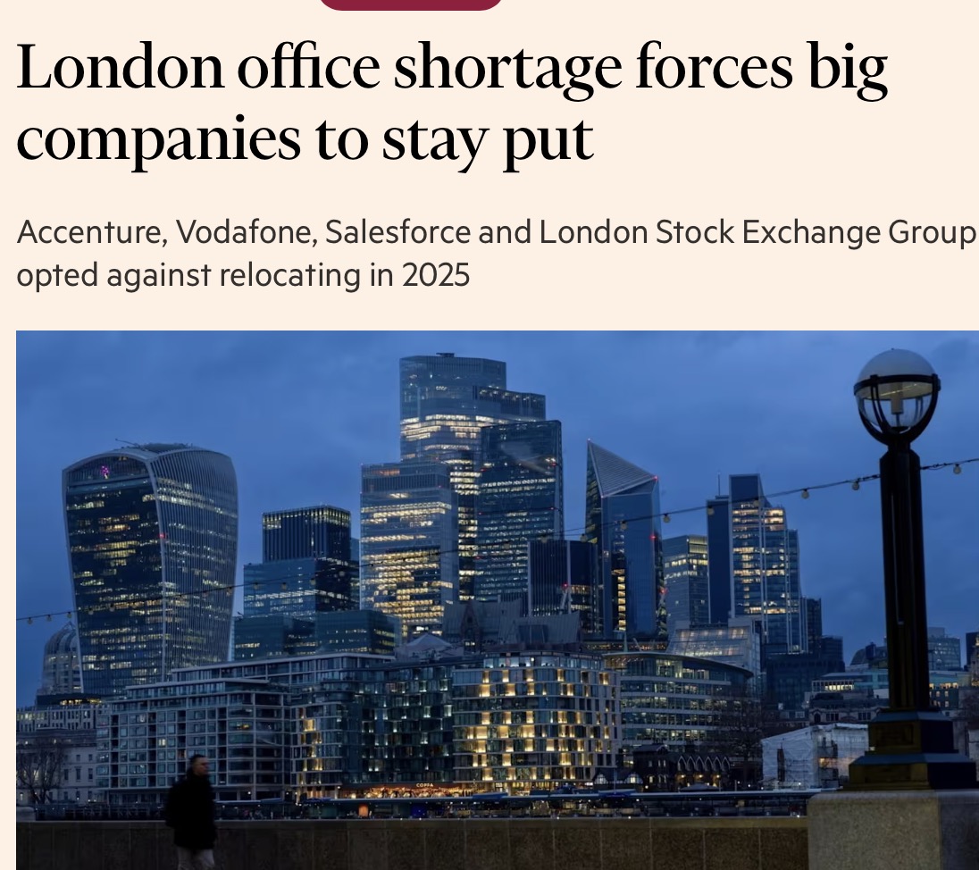 - 伦敦办公楼短缺加剧,大型企业被迫“原地不动”。
