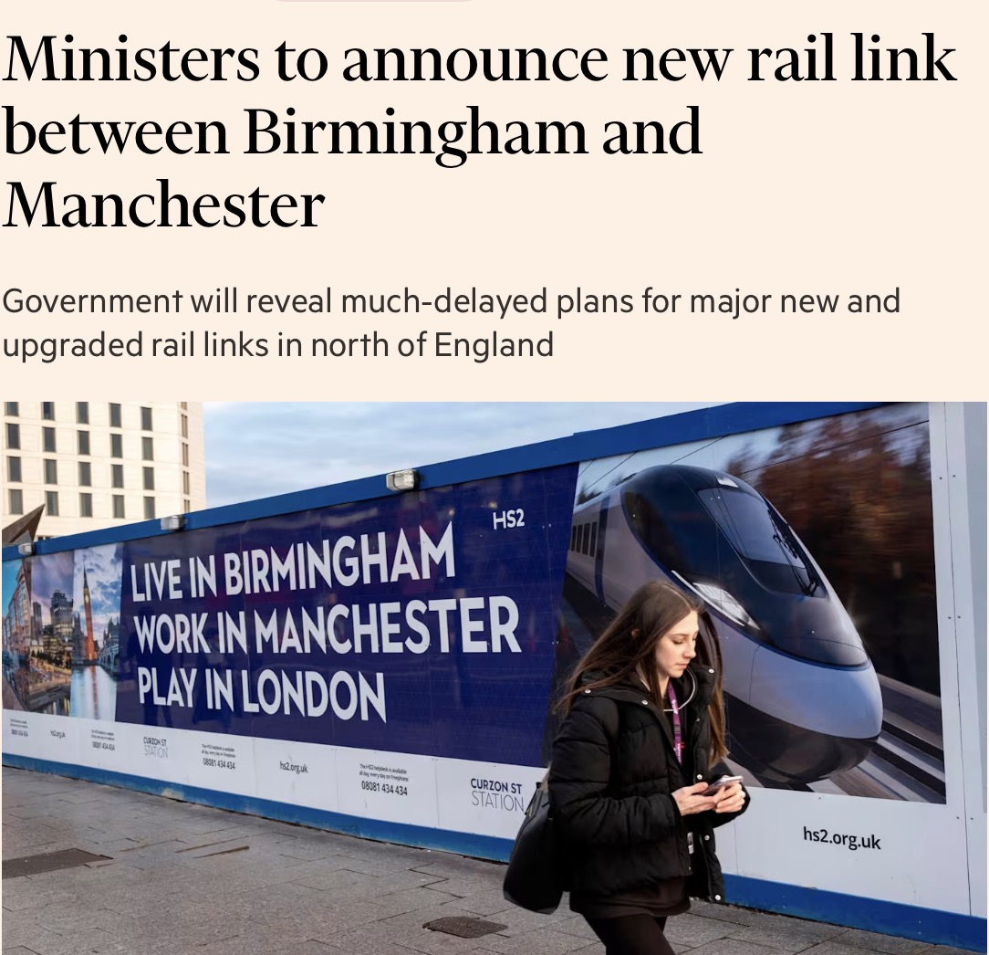 多名知情人士透露,新计划将包括一项承诺:在北方经济引擎铁路NPR项目建成之后,再建设一条连接伯明翰与曼彻斯特的新铁路线路,以部分替代此前被取消的HS2北段工程。