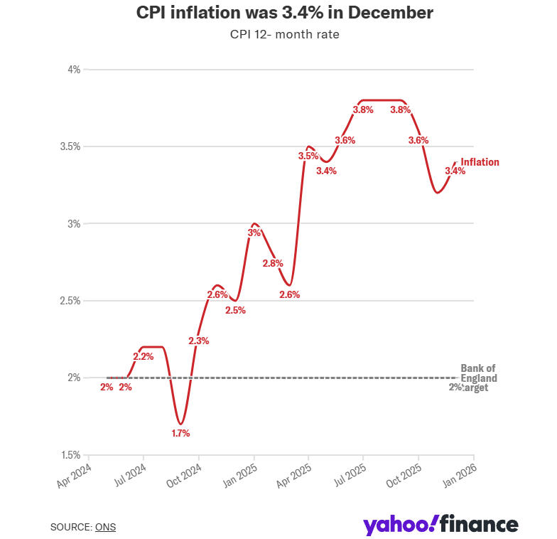 英国国家统计局(ONS)数据显示,12月消费者价格指数从11月的3.2%升至3.4%,超出经济学家预期的3.3%。当月物价环比上涨0.4%。