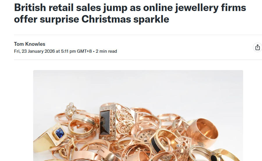 ONS高级统计师Hannah Finselbach指出:“12月线上珠宝商因金银需求上升而获得提振。由于黄金被视为避险商品,在全球宏观经济不确定性中价格屡创新高,逼近每盎司5,000美元。”