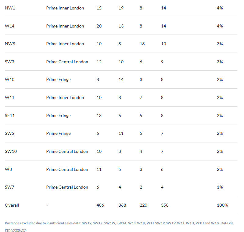 在伦敦中心区域,SW1(贝尔格莱维亚、威斯敏斯特及维多利亚,Belgravia, Westminster & Victoria)和W2(帕丁顿、贝斯沃特、海德公园,Paddington, Bayswater, Hyde Park)表现最佳,月均销售19套。