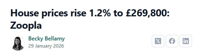 Zoopla的最新数据显示,在截至2025年底的一年里,英国平均房价上涨1.2%,增加3,200英镑,达到269,800英镑。