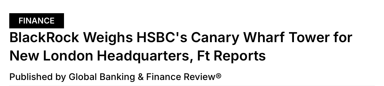 - BlackRock考虑将金丝雀码头HSBC大楼定为伦敦新总部,同时宣布10亿英镑NHS房产投资计划。