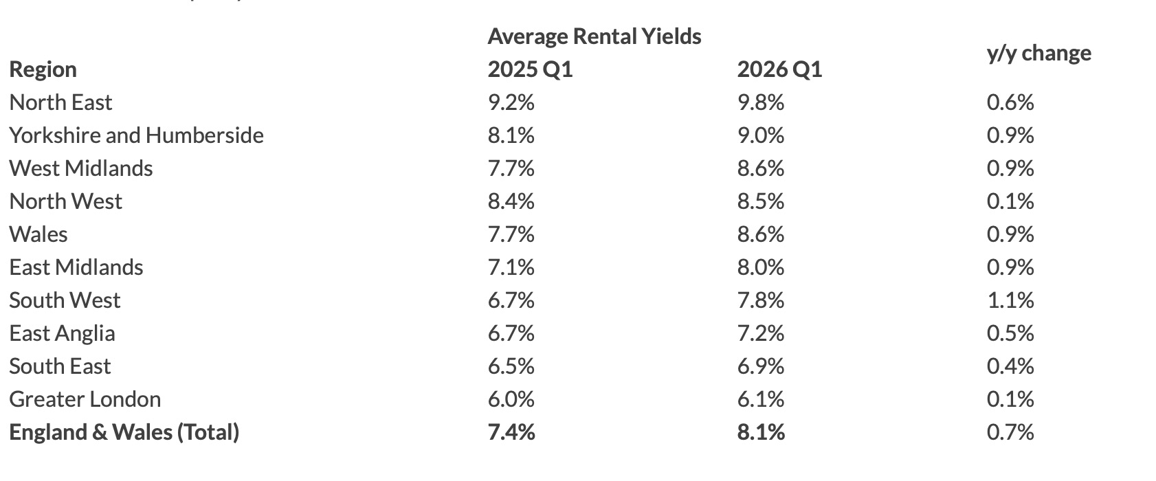 英国购房出租市场在2026年第一季度迎来了一个清晰的好消息,英格兰各地区的租金回报率,一个都没有跌。