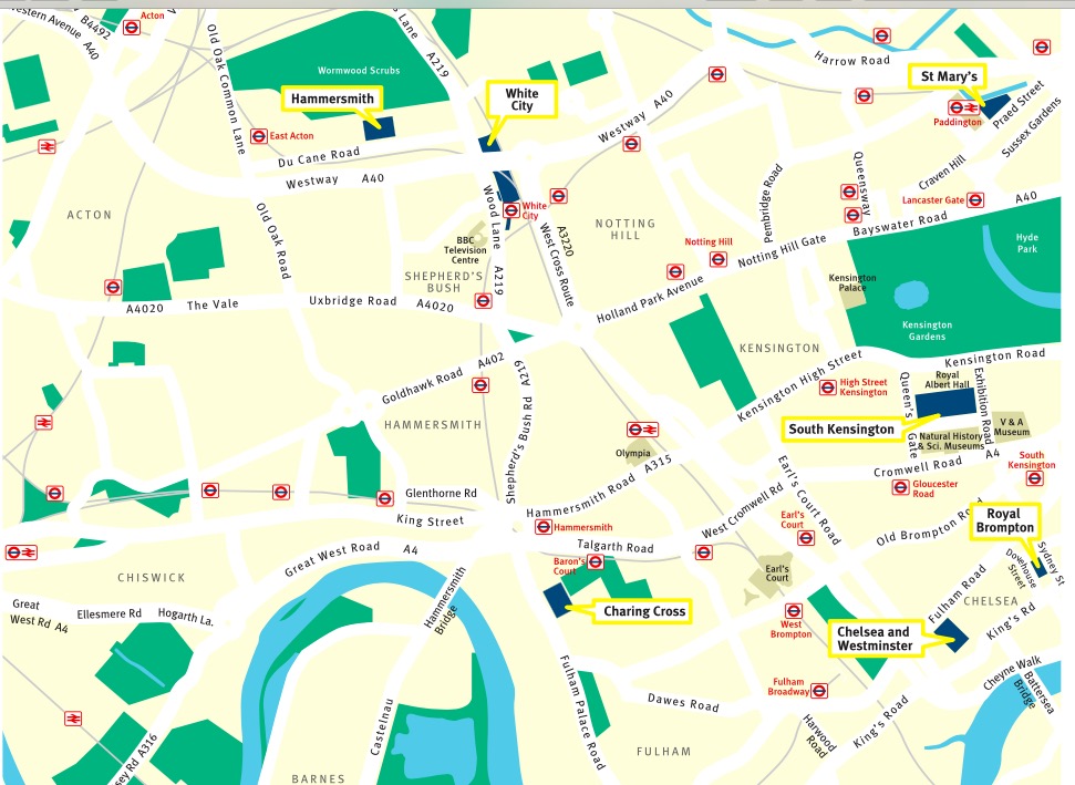 以主校区为例,South Kensington校区附近的车站有South Kensington Station等。
