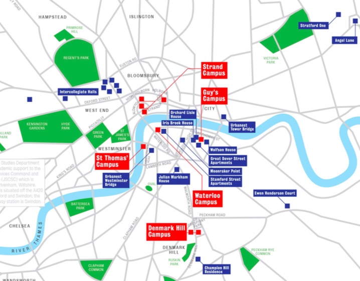 校区分别为:Denmark Hill,Strand,Waterloo,St Tomoas‘, Guy’s