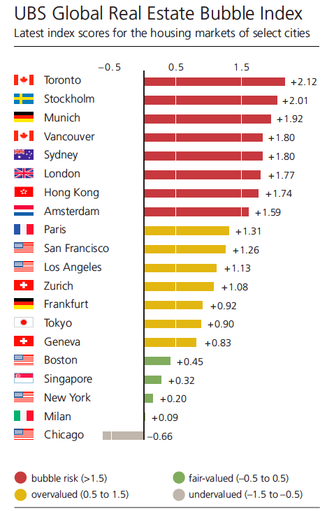 日前,瑞士银行(UBS)发布了世界各大城市房地产泡沫危机报告,分析了全球各大城市的区域房地产市场产生泡沫的危机程度。