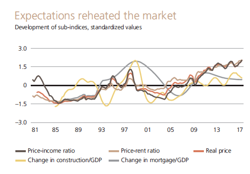 如下图所示:从1981年到2017年,英国价格收益比率(紫色),租金收益率(棕色),房价涨幅(红色),建筑业占国内生产总值比率(黄色),贷款占国内生产总值比率(灰色)。