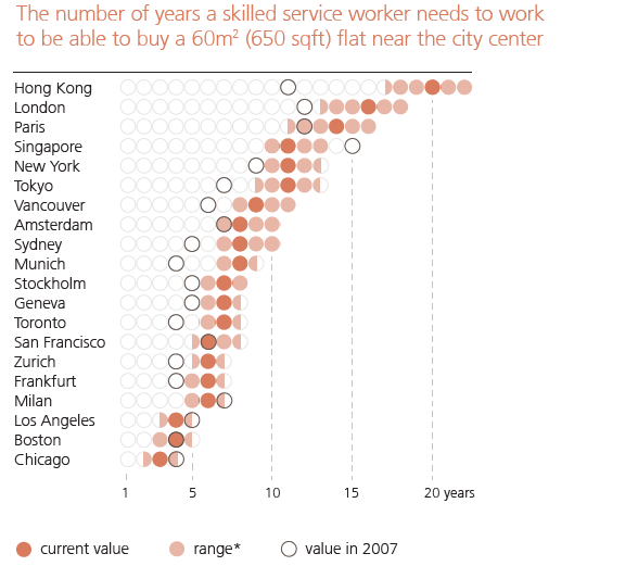 如下图所示:在全球的大城市,需要一套市中心旁边的60平米公寓需要工作多少年