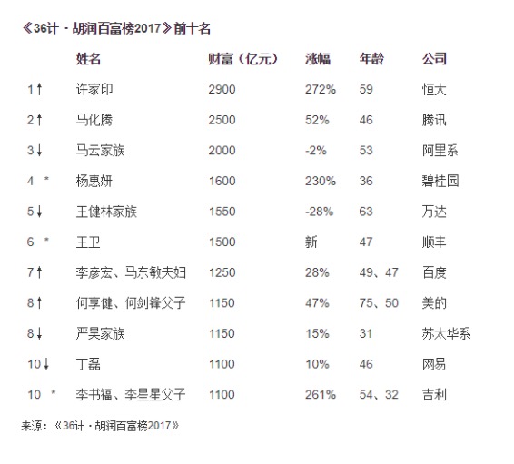 下图为英国的胡润总结的2017中国富豪榜,许家印以400亿元的差距遥遥领先。
