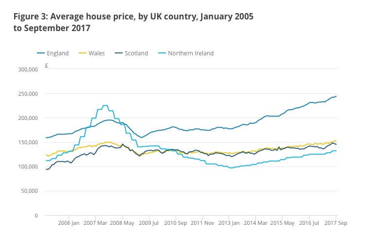 如下表所示:2004年到2017年9月英国英格兰,威尔士,苏格兰和北爱尔兰的房价变化情况