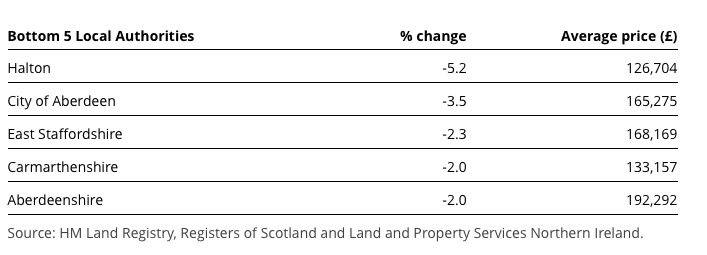 来自英国国土局的数据显示,2017年9月,英国房价年涨幅最大的五个地区如下图所示