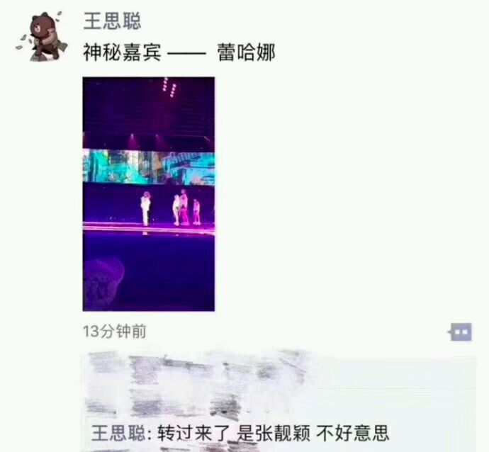 当张靓颖背对舞台的时候,思聪哥还以为是神秘嘉宾蕾哈娜Rihanna