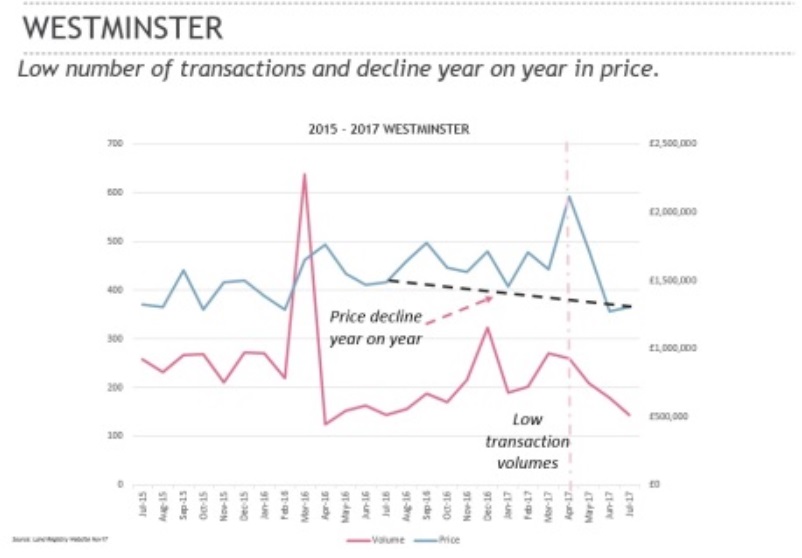 下图为2015年-2017年西敏地区成交量和房价关系。两年以来总体处于小幅下跌状态,并预计将维持到明年。