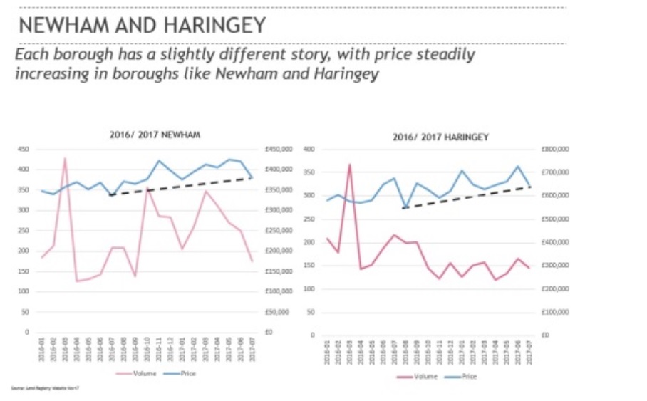 上面两张图是Newham和Haringey 16-17年的市场情况,反应在房价上面略有起伏,但总体上行。未来几年之内都将维持这个趋势。