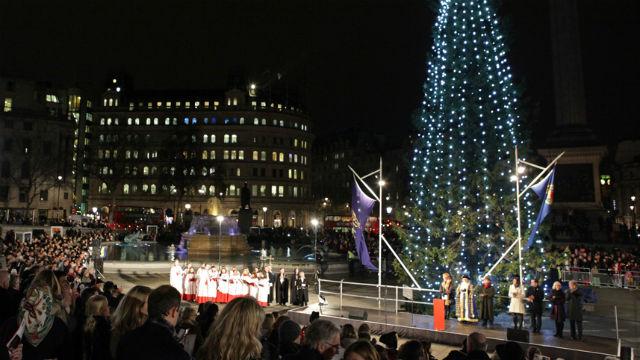 特拉法加广场上,那棵举世闻名的圣诞树下,人们诵唱着圣诞歌曲。