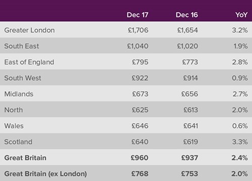 2017最后一个月(12月),英国平均房租增长了£276,对比同年第一个月(1月),涨幅达2.4%。