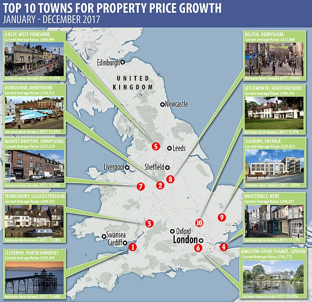 如下图所示:2017年1月到12月英国房价上涨最大的十个城镇