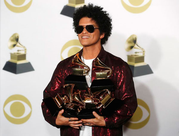 要说本届格莱美的最大赢家,当数火星哥Bruno Mars,可谓是横扫格莱美:
