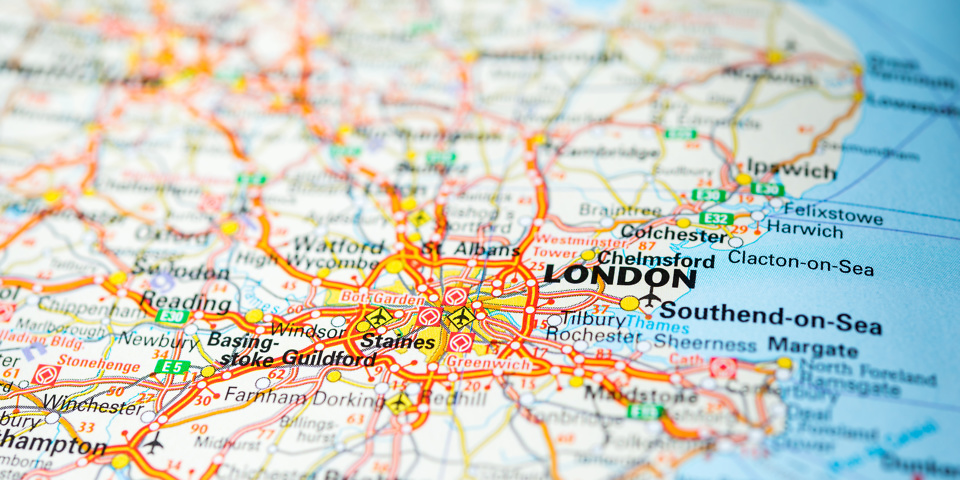 在伦敦以外的地区中,百万房产集中分布在英格兰东部和英格兰东南(图中蓝点标示)。