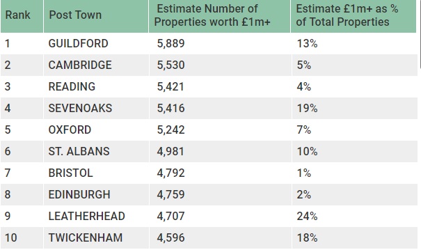 排名第二第三的 Cambridge 和 Reading 虽然在数量上和Guildford很接近,分别达到了5530和5421套百万英镑以上豪宅,但占所有房屋的总比例不到5%。