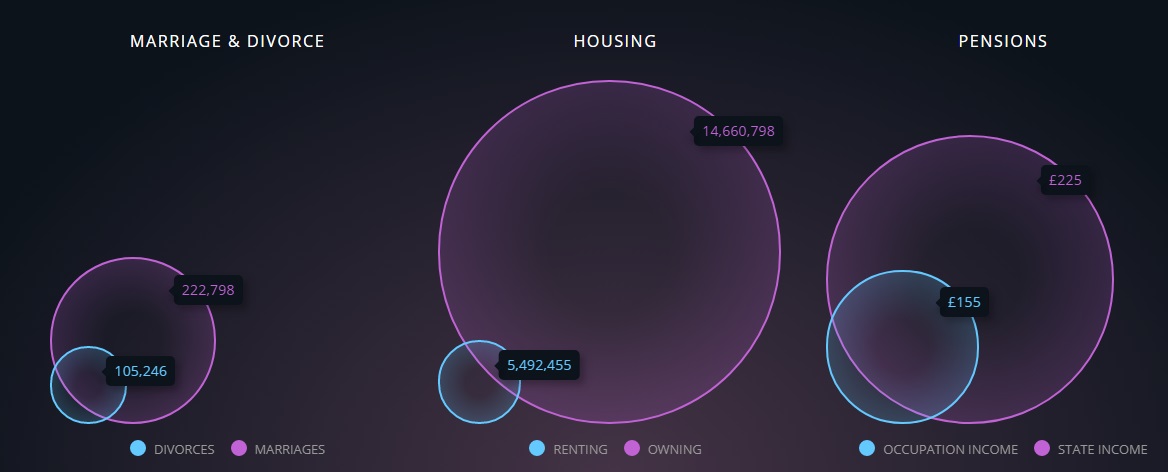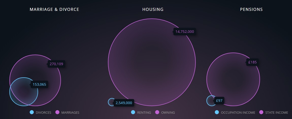 下图为2003年数据,三个饼图分别对应离婚&结婚(Marriage&Divorce)、住房(Housing)和退休金(Pensions)。