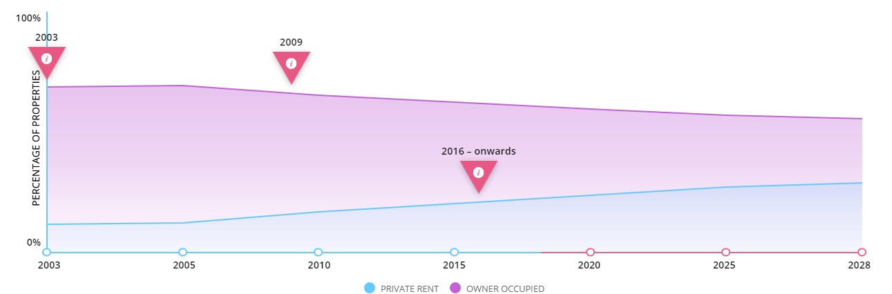 从2003年英国国家统计局ONS开始统计房产数据开始,英格兰的自住房持有量处于一个持续下滑的趋势之中。换句话说,就是英国有房的人越来越少了。