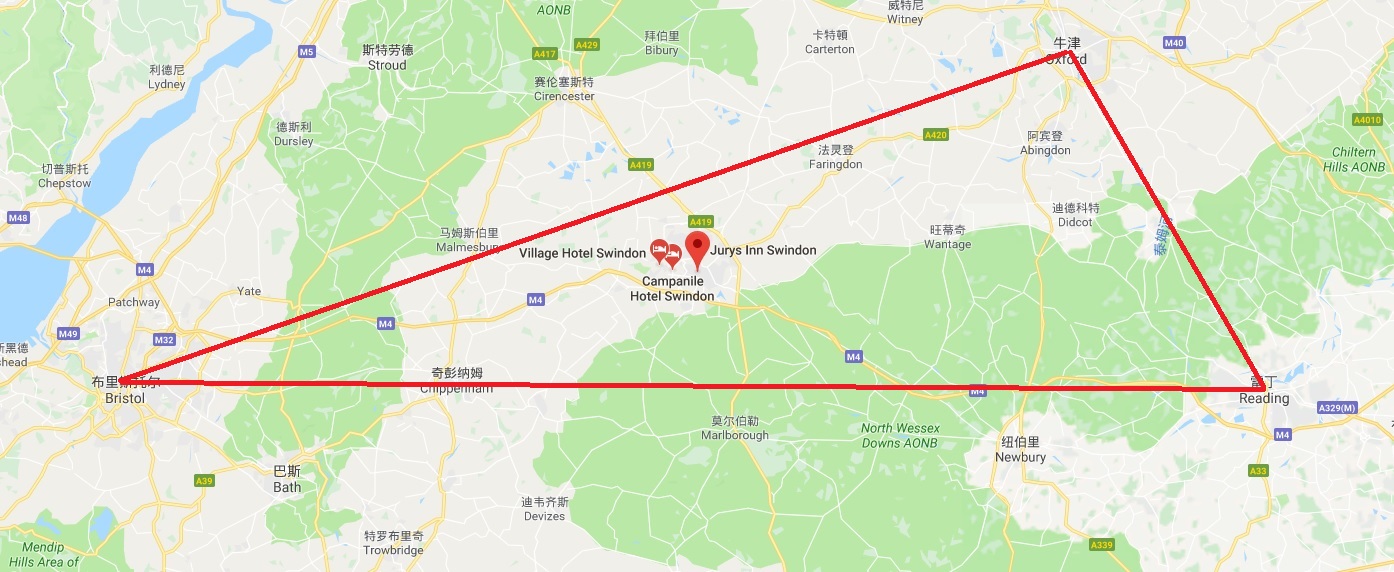 Swindon 介于 Bristol,Reading和 Oxford组成的三角形的中心,