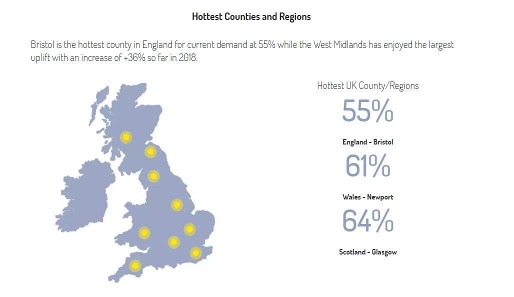 Emoov 前两天发布了2018年第一季度的房产热点指数(Hotspots Index),指出2018年第一季度英格兰的整体住房需求继续保持旺盛,约为30%。