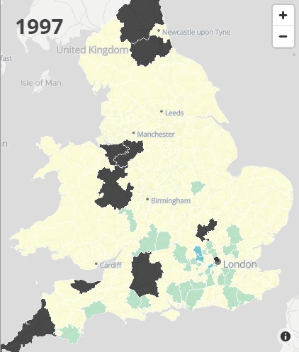 到了2017年,深色区域覆盖了英格兰绝大多数的地区:(如下图所示,颜色越深意味着房价工资比越高)