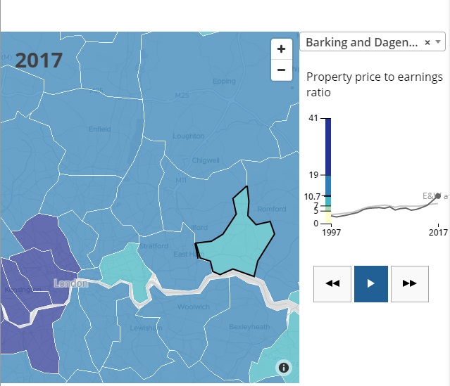 其中,Tower Hamlet 和 Barking and Dagenham 这两个区,是伦敦仅剩的两个房价工资比小于10的区。