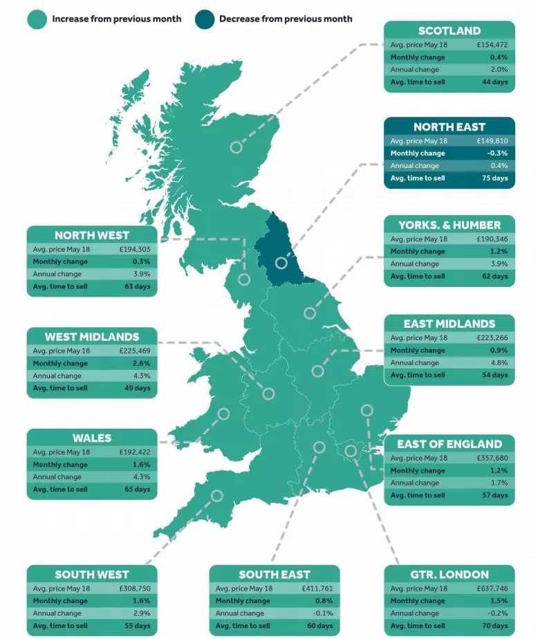 - 新入市场的房主5月再次将英国房屋要价推至新高,英格兰10个地区中有7个地区达到历史最高点,米德兰兹地区受搬家人数影响,增幅最大,年增长率4%。