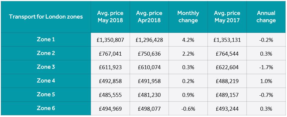 如下图所示:2017年5月,2018年4月5月伦敦1-6区房价的变化。