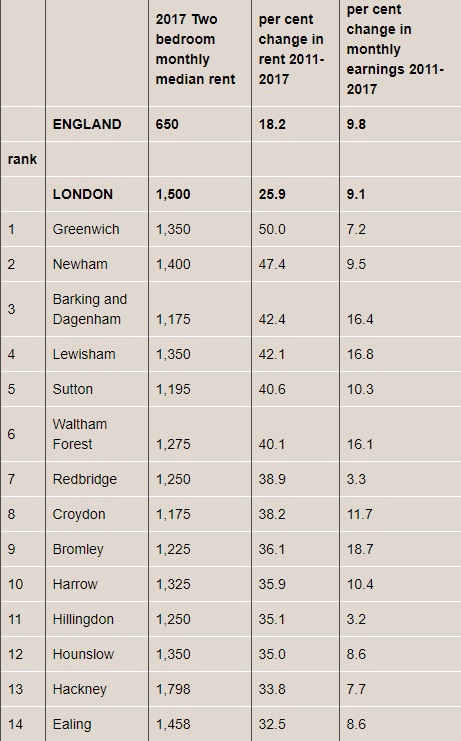 伦敦各区,2017年租金中位数,2011年-2017年租金涨幅,2011年-2017年工资涨幅