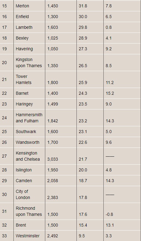 可以看到,以租金涨幅排在前四的分别是Greenwich,Newham,Barking & Dagenham以及Lewisham,是东伦敦紧挨着的四个区,也是伦敦这几年来“向东发展”趋势中获益最大的几个区。