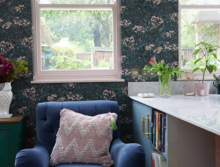 小碎花的墙纸搭配蓝色的家居和白色的屋顶,有一种纯净美好的感觉