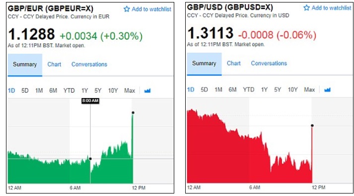 加息决议公布之后,迎合市场预期的英镑立刻出现强势抬头(图左兑欧元,图右兑美金)