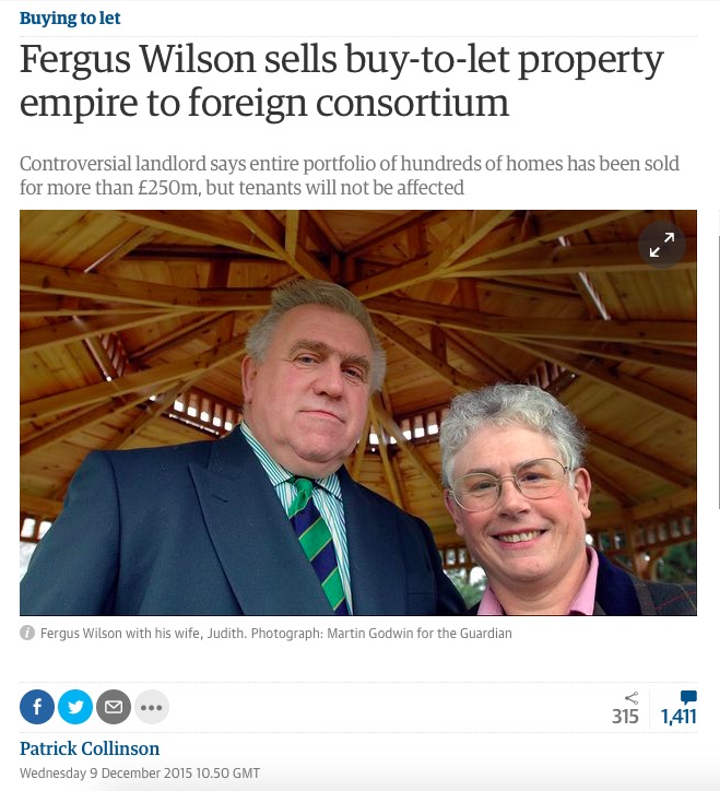2015年底,Fergus和妻子又把自己几百套房产打包出售给了海外的财团,售价超过2.5亿英镑。