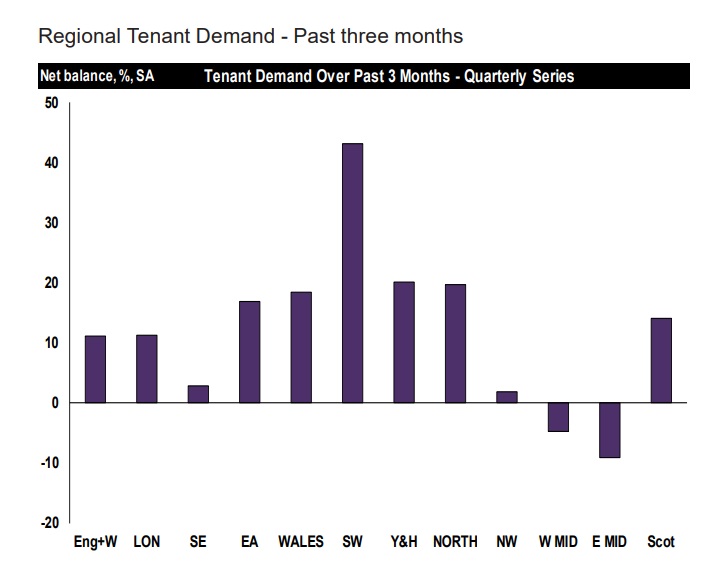 地区性数据如下,除了中部地区以外,寻找房源的租客平均增加了10%。适合旅游,养老以及年轻家庭的西南英格兰尤为突出,涨幅达到了45%。