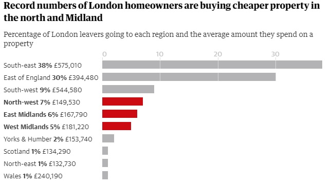 而东北英格兰和威尔士等地人口持续流入伦敦,东南英格兰的平均房价突破伦敦工资水平的阀值,所以今年开始就有变化了。调查报告指出以小换大的搬家人数在西北和米德兰兹地区显著增加,虽然一部分人依然要去伦敦上班。
