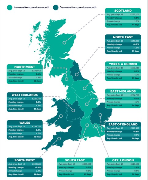9月英国平均房价为 £304,061,对比去年上涨了1.2%。当然这只是平均水平,英国的有些地区平均房价上涨了4%以上,上涨超过4% 的地区有:东米德兰兹East Midlands (4.7%), 威尔士Wales (4.6%), 西米德兰兹 West Midlands (4.5%)和约克郡和亨伯Yorkshire and the Humber (4%)。
