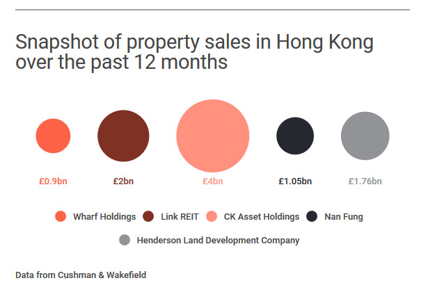 在香港,九龙仓集团(Wharf Holdings)卖了9亿英镑,领汇房产基金(Link REIT)卖了20亿英镑,李嘉诚的长江实业集团有限公司(CK Asset Holdings Limited)卖了40亿英镑,南丰集团(Nan Fung)卖了10.5亿英镑,恒基地产(Henderson Land)卖了17.6亿英镑…