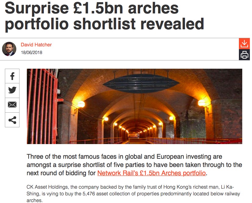 收购「5 Broadgate」物业3天之后,据英媒报道,包括长江实业在内的三家国际投资机构,成功入围了英国国家铁路公司(Network Rail)总货值15亿镑的铁路桥洞(Arches)零售、办公等商用物业资产的下一轮竞标。