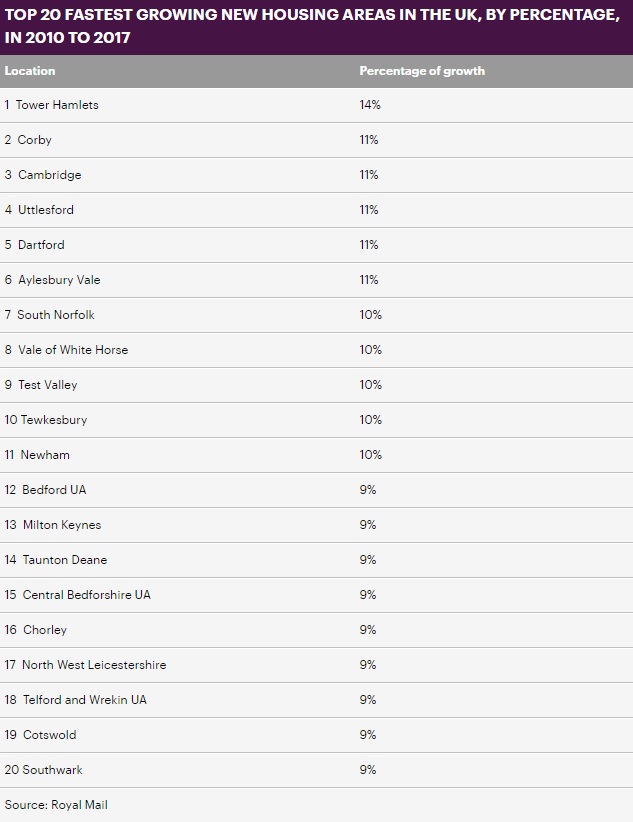 如下图所示:2010年到2017年,英国新房增速最快的20个地区